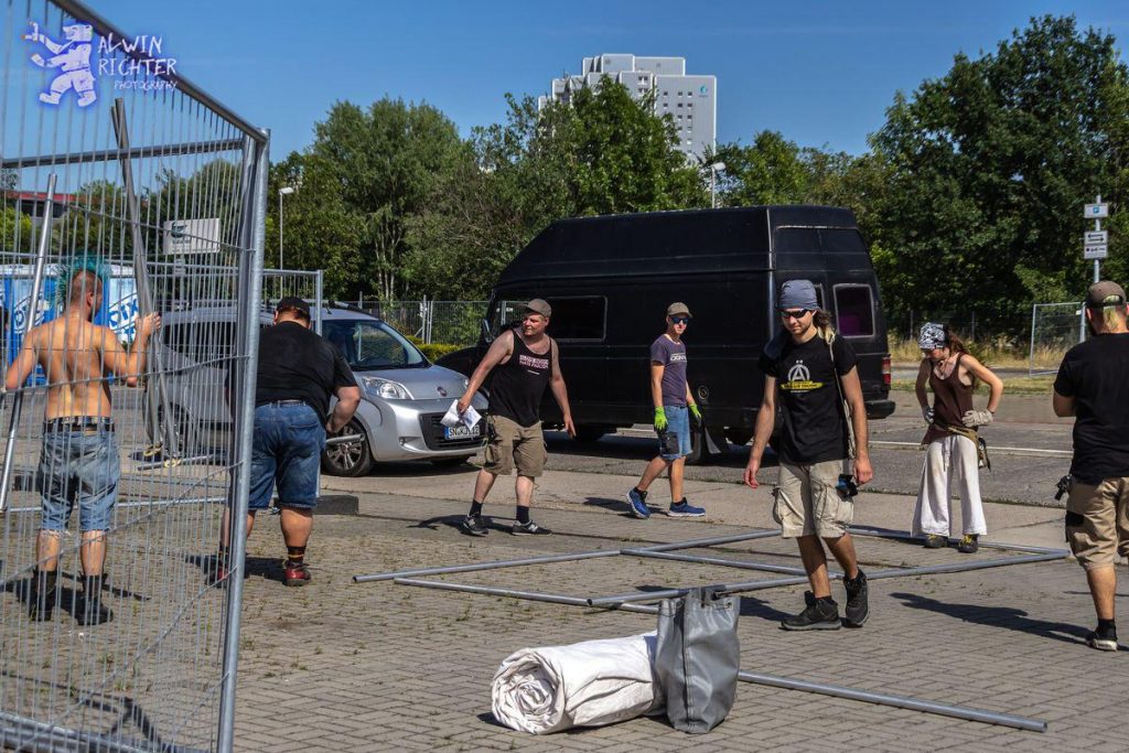 Heute haben wir ein ordentliches Stück geschafft. Der Großteil der Zäune steht, die Zelte für Sanis, Schutz, Awareness und für andere Gewerke stehen. Die Bauptbühne sieht endlich auch nach Bühne aus. Wir haben wirklich eine tolle Helfercrew!