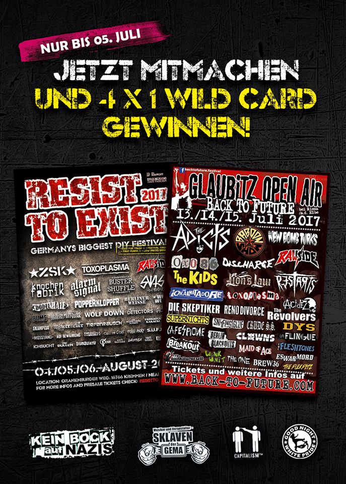 Teilen, liken und mit Glück 4 x 1 Wild Card für gleich ZWEI Festivals – das BACK TO FUTURE / Glaubitz Open Air und das Resist To Exist Festival 2017 (Vol. XIV) – abstauben!!!
