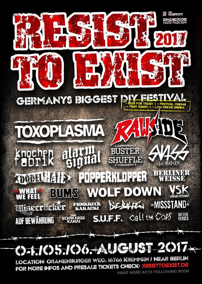 Hier der Vorabflyer für das RESIST TO EXIST 2017, 04./05./06. August 2017 @ Kremmen bei Berlin. Weitere Acts und der VVK-Start folgen in Kürze, sobald wir hier ein weitere Weiche gestellt haben. Vorfreude, schönste Freude! =)